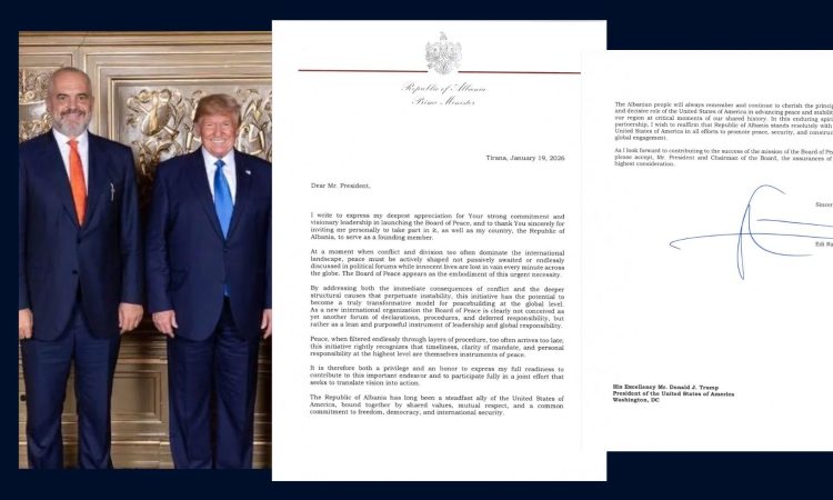 Kryeministri Edi Rama, ka publikuar letrën dërguar presidentit të Shteteve të Bashkuara të Amerikës Donald Trump, në të cilën konfirmon pjesëmarrjen e Shqipërisë në Bordin e Paqes.