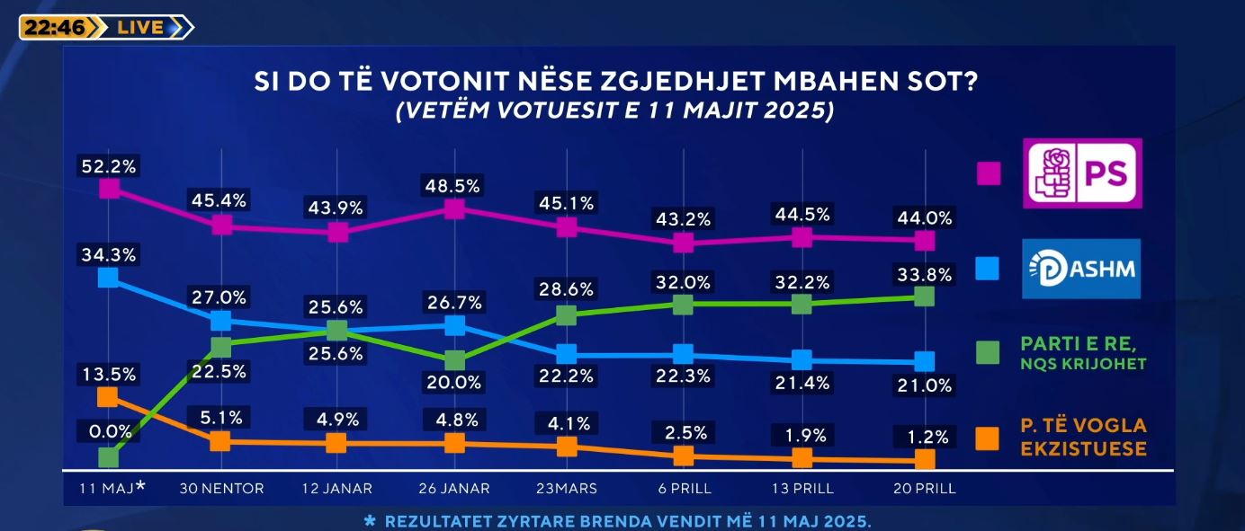 Dështimi i skenarit të protestës, e rrëzon Partinë Demokratike sot në 21% (15-18 për qind), por bashkë me PD bie dhe PS në 44%, dhe pse diferenca është e thellë, ka dhe një ndryshim... Më shumë