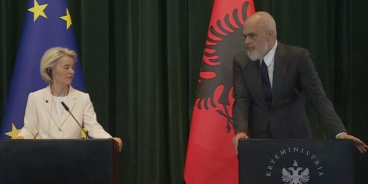 Kryeministri Edi Rama ka folur me data konkrete, ndërsa theksoi se në 2027 pret që Shqipëria të anëtarësohen në BE. Në një konferencë të përbashkët me presidenten e Komisionit Europian, Ursula von der Leyen, Rama tha se detyrat i bëjnë për veten dhe jo se i kërkon BE.